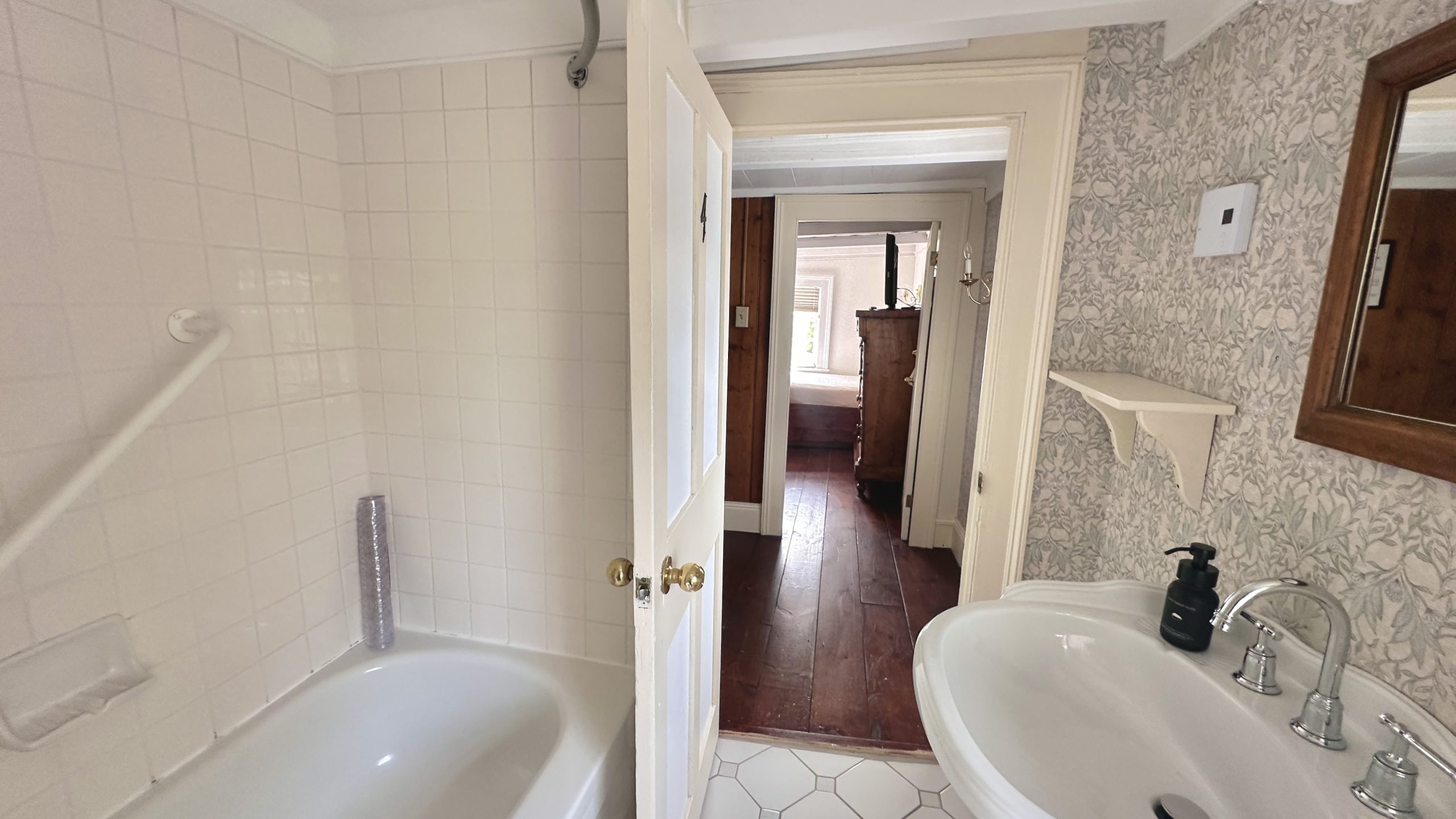 Bathroom: Located at top of stairs, across from the double and single bathroom.